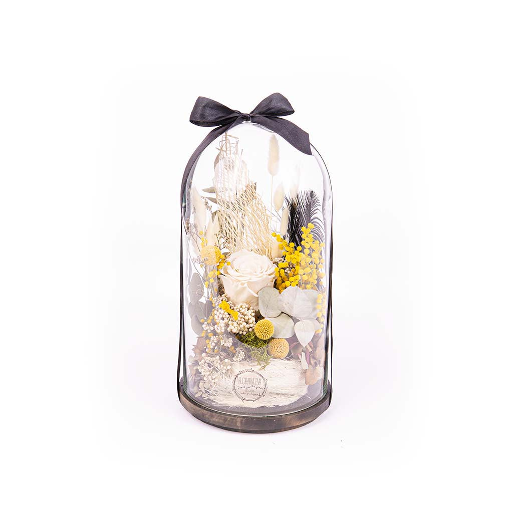 Aranjamentul este lucrat în cupola de sticlă, și conține 1 trandafir criogenat, articole decorative, flori și frunze uscate.