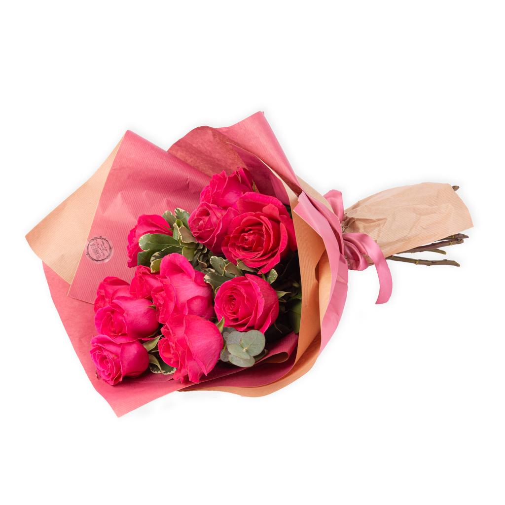 Se spune că trandafirul pink există de când. Şi tot de atunci, exprimă naturaleţea, libertatea, sălbăticia prin toată splendoarea ei. Cât de natural e fiecare fir de trandafir cuprins în acest buchet de 11 trandafiri pink încununaţi de ramurile de Eucalypt şi frunzele de Pittosporum de un verde magic care scot în evidenţă vibraţia trandafirilor pink!